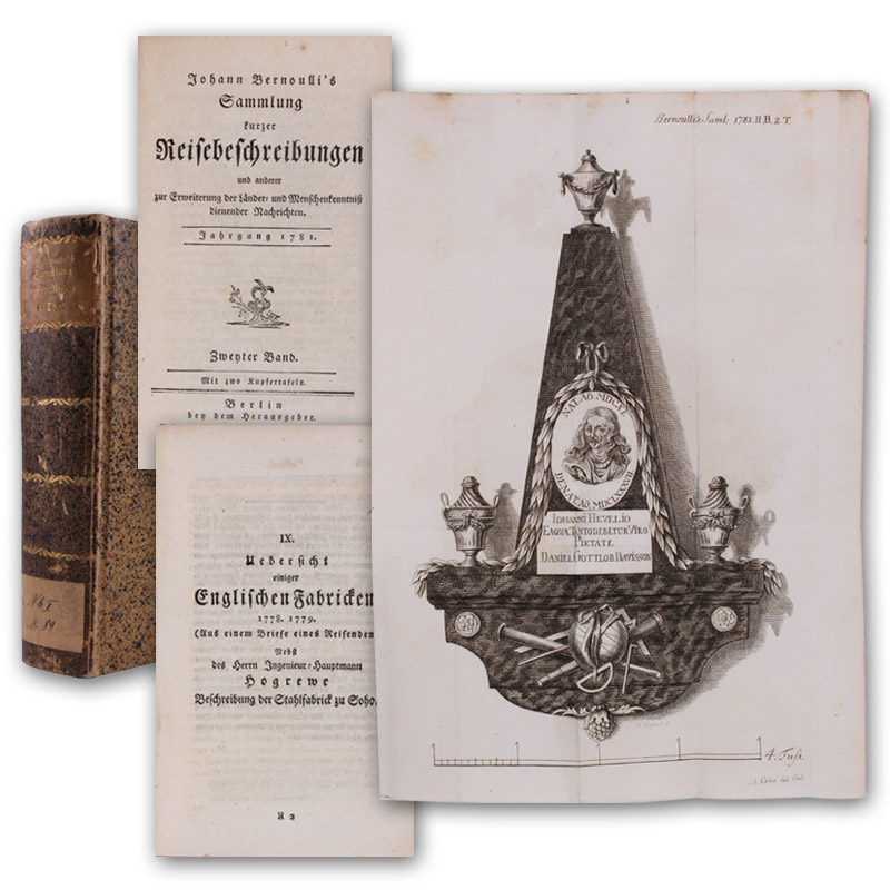 (Aus den Briefen eines Reisenden). Nebst des Herrn Ingenieur-Hauptmann Hogrewe Beschreibung der Stahlfabrik zu Soho. SS. (307)-332. - Und: Gabmal des Hevelius. SS 404-407. Mit 1 Tafel. In: Johann Bernoulli's Sammlung kurzer Reisebeschreibungen. Jg. 1781, Band 2.