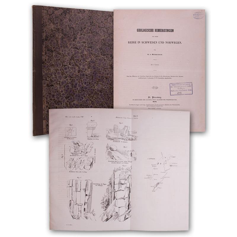 St. Petersburg, Buchdruckerei der K. Akad. der Wissenschaften, 1858. (31 x 23 cm). 43 S. Mit 3 lithographierten Tafeln, davon 1 gefaltet. Halbleinwandband der Zeit. (Sonderdruck [...]