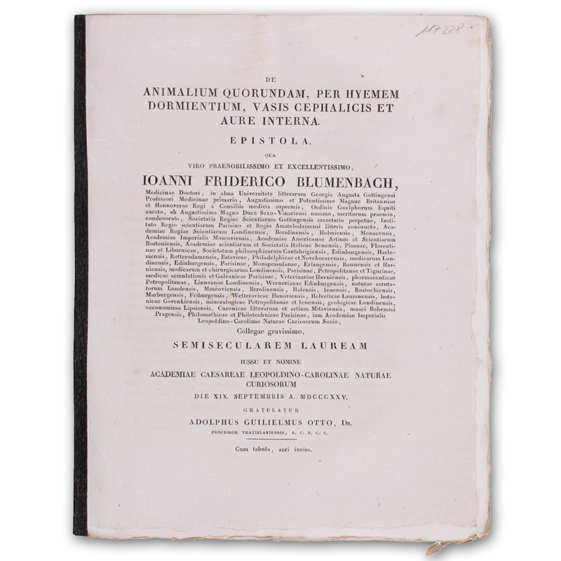 De animalium quorundam, per hyemen dormientium, vasis cephalicis et aure interna. Epistola qua ... Ioanni Friderico Blumenbach... semisecularem lauream.