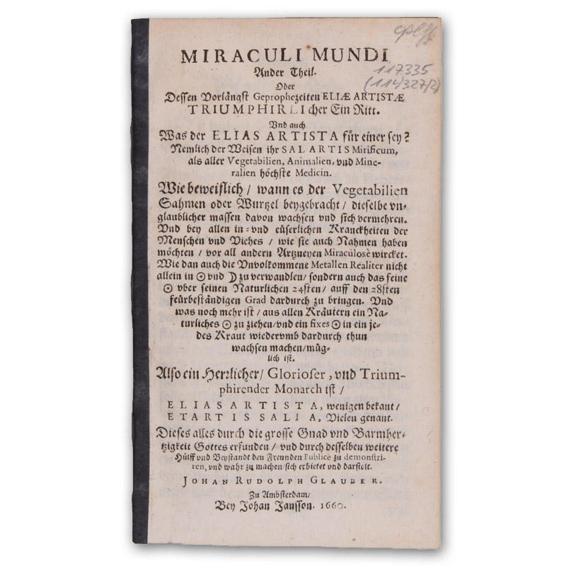 Miraculi mundi ander Theil. Oder dessen vorlängst geprophezeiten Eliae Artistae Triumphirlicher ein Ritt. Und auch was der Elias Artista für einer sey? Nemlich der Weisen ihr Sal artis mirificum, als aller Vegetabilien, Animalien, und Mineralien höchste Medicin.