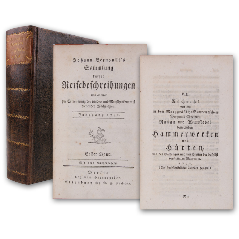 Bergamts-Revieren Nailau und Wunsiedel befindlichen Hammerwerken und Hütten, von den Gattungen und den Preisen der daselbst verfertigten Waaren. SS. (259)-274. In: Johann Bernoulli's Sammlung kurzer Reisebeschreibungen. Jg. 1781, Band 1.