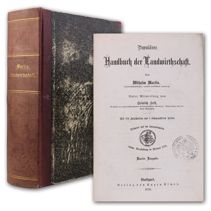 Stuttgart, Ulmer, 1876. (21 x 14,5 cm). XII, 832 S. Mit 274 Textholzschnitten und 5 gefalteten farbig lithographierten Plänen. [...]