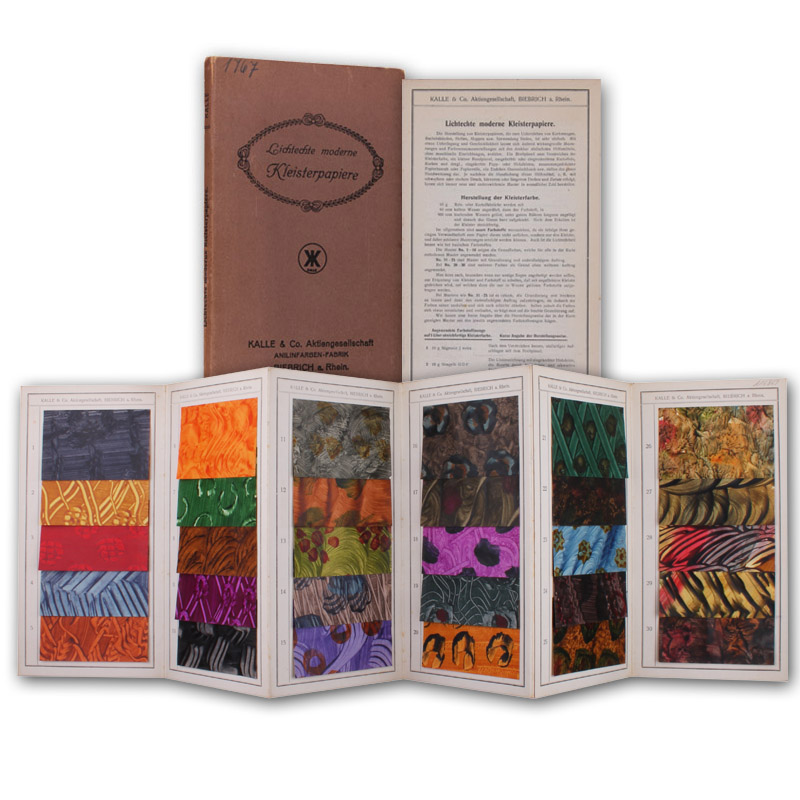 Biebrich, (Ca. 1910). (23,5 x 12,5 cm). 1 Bl. Beschreibungen und 6 Bll. aus Karton. Mit 30 montierten Original-Kleisterpapiermustern. [...]
