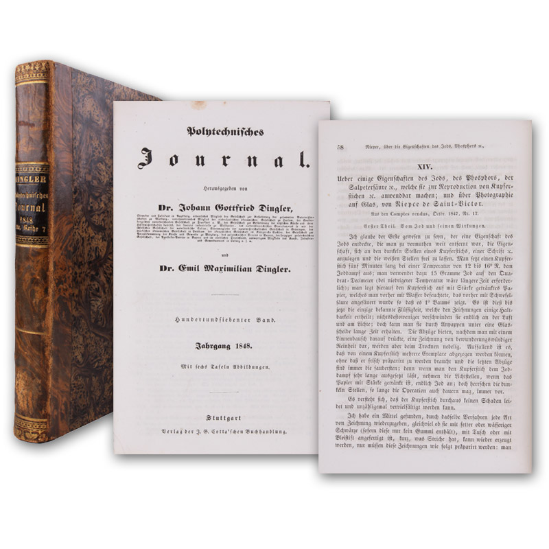 Ueber einige Eigenschaften des Jods, des Phosphors, der Salpetersäure etc., welche sie zur Reproduction von Kupferstichen etc. anwendbar machen; und über Photographie auf Glas. SS. 58-68. - Und: (Michel Eugčne) Chevreul. Bericht über die Versuche des Hrn. Niepce hinsichtlich der Wirkung des Jod-, Phosphor-, Salpetersäure-Dampfs etc. auf Kupferstiche und Metallflächen etc. und die Anwendung derselben zur Erzeugung von Lichtbildern. SS. 111-119. In: Polytechnisches Journal. Hrsg. J. G. Dingler. Band 107.