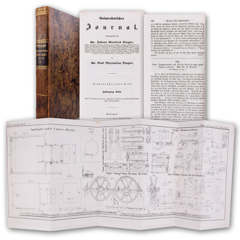Ueber Daguerreotypie und Voigtländer's neue große Camera obscura. SS. 128-134. Mit Abbildungen. In: Polytechnisches Journal. Hrsg. J. G. Dingler. Band 86.