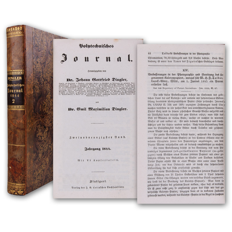 Verbesserungen in der Photographie und Bereitung des sogenannten Kalotyppapiers. SS. 44-46. - Und: (Louis Jacq. Mandé) Daguerre. Ueber ein neues Verfahren die empfindliche Schicht auf den zu Lichtbildern bestimmten Metallplatten anzubringen. SS. 284-290. - Und: George S. Cundell. Anleitung zur Darstellung von Lichtbildern nach dem sogenannten Kalotypprozeß. SS. 367-378. Mit Abbildungen. In: Polytechnisches Journal. Hrsg. J. G. Dingler. Band 92.
