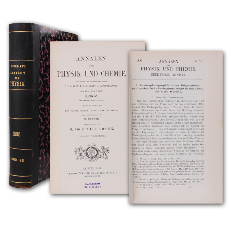 Farbenphotographie durch Körperfarben und mechanische Farbenanpassung in der Natur. SS. 225-281. In: Annalen der Physik und Chemie. NF. Band 55.