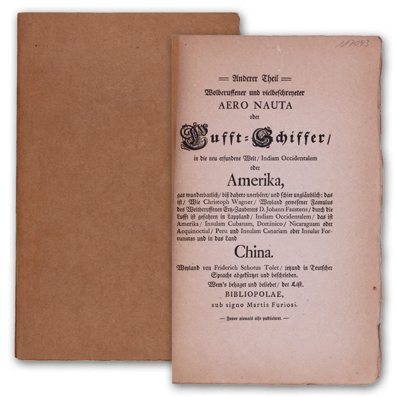 Wolberuffener und vielbeschreyeter Aero nauta oder Lufft-Schiffer, in die neu erfundene Welt, Indiam Occidentalem oder Amerika... das ist, wie Christoph Wagner, weyland gewesener Famulus des weltberuffenen Ertz-Zauberers D. Johann Faustens, durch die Lufft ist gefahren in Lappland, Indiam Occidentalem ... und in das Land China. Anderer Theil.