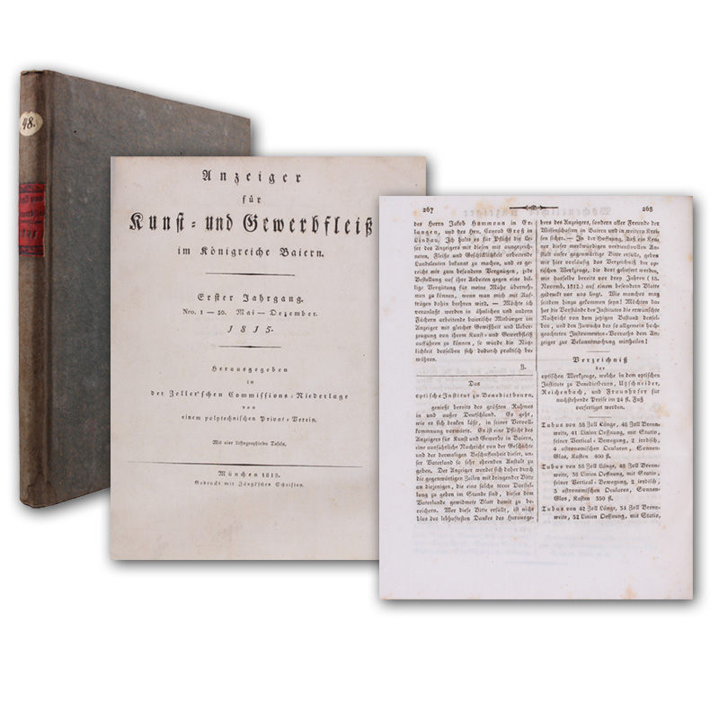 Verzeichniß der optischen Werkzeuge, welche in dem optischen Institut zu Benedictbeuren... verfertigt... werden. Spalten 268-270. In: Anzeiger für Kunst - und Gewerbefleiß im Königreiche Baiern. Jg. 1.