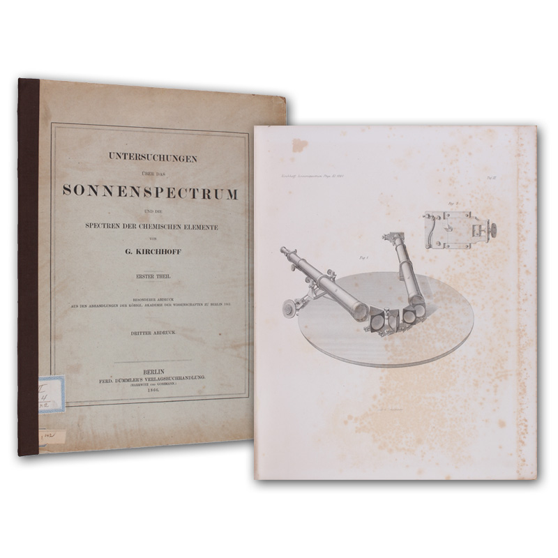 Du rapport entre le pouvoir émissif et le pouvoir absorbant des corps pour la chaleur et la lumičre. Traduit de l'allemand par G. Leclanche. SS. 160-192. - Und: Kirchhoff, (Gustav) und R(obert) Bunsen. Analyse chimique fondée sur les observations du spectre. Premier Mémoire. SS. 452-486. Mit 1 farbigen Tafel. In: Annales de Chimie et de Physique. 3e Series. Tome 62.