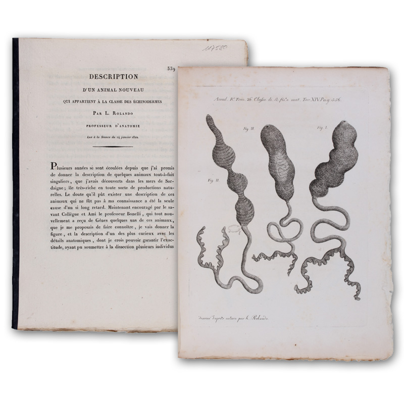 (Turin, 1822). (27,5 x 22,5 cm). SS. 539-556. Mit 2 Kupfertafeln. Rückenbroschur, unaufgeschnitten. (Aus: Memorie della [...]