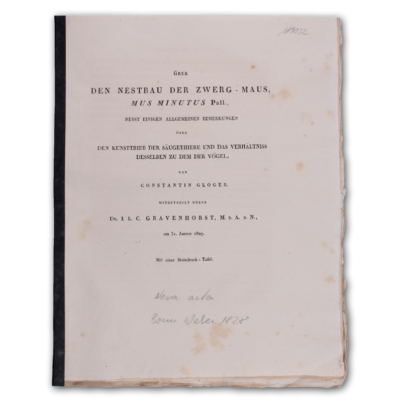 Ueber den Nestbau der Zwerg-Maus, Mus minutus Pall., nebst einigen allgemeinen Bemerkungen über den Kunsttrieb der Säugethiere und das Verhältniss desselben zu dem der Vögel... Mitgeteilt von J. L. C. Gravenhorst.
