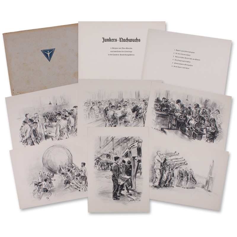 Junkers-Nachwuchs. 6 Skizzen von Theo Matejko aus dem Leben der Lehrlinge in den Junkers-Ausbildungsstätten.