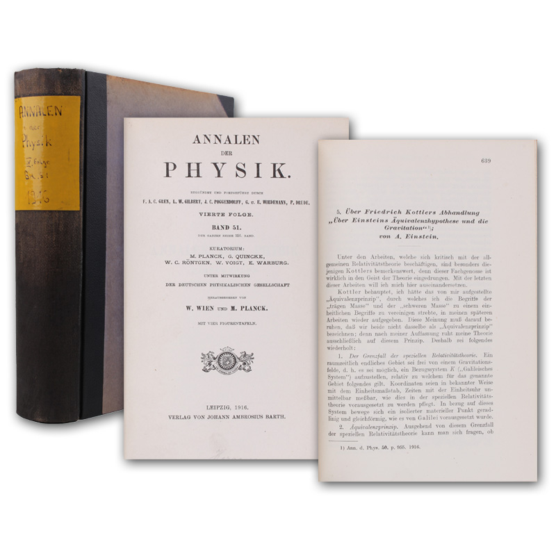 Lichtgeschwindigkeit und Statik des Gravitationsfeldes. 15 S. - Und: Derselbe. Zur Theorie des statischen Gravitationsfeldes. 16 S. - Und: Derselbe. Nachtrag zu meiner Arbeit: "Thermodynamische Begründung des photochemischen Äquivalentgesetzes". 4 S. - Und: Derselbe. Antwort auf eine Bemerkung von J. Stark: "Über eine Anwendung des Planckschen Elementargesetzes". 1 S. In: Annalen der Physik. Folge 4. Band 38.