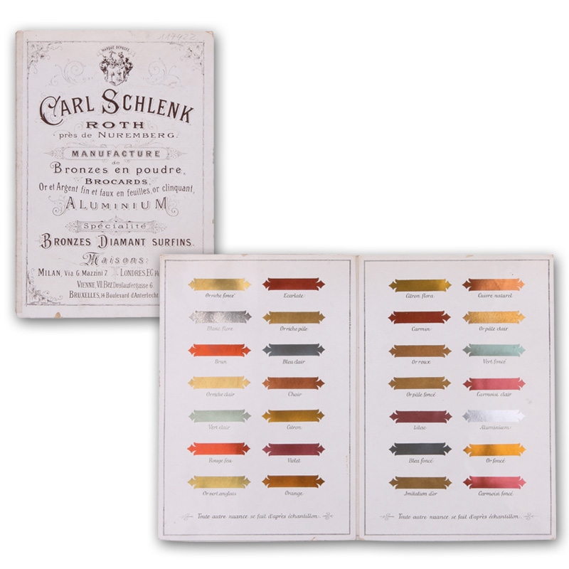 Manufacture de Bronzes en poudre, Brocards, Or et Argent fin et faux en feuilles, or clinquant, Aluminium. Spécialité Bronzes, Diamant Surfins.