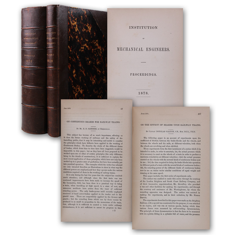 On Continuous Brakes for Railway Trains. SS. 67-105. Mit 9 (statt 10) Tafeln. - Und: Douglas Galton. On the Effect of Brakes upon Railway Trains. SS. 467-489. Mit 6 Tafeln. In: Proceedings of the Institution of Mechanical Engineers. Text- und Tafelband in 2 Bänden.