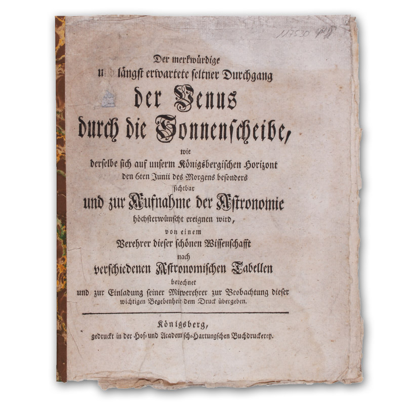 seltner Durchgang der Venus durch die Sonnenscheibe, wie derselbe sich auf unserm Königsbergischen Horizont (1761) den 6ten Junii des Morgens besonders sichtbar und zur Aufnahme der Astronomie höchsterwünscht ereignen wird, von einem Verehrer dieser schönen Wissenschafft nach verschiedenen Astronomischen Tabellen berechnet.