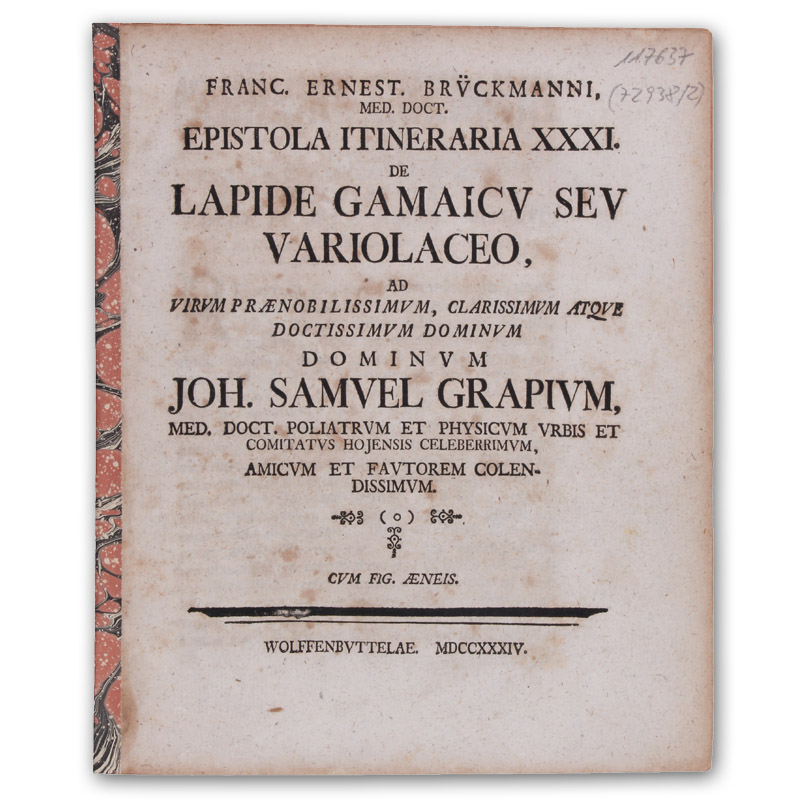 Wolfenbüttel, 1734. (20,5 x 17 cm). 11 S. Mit 1 Kupfertafel. Rückenbroschur. (Epistola itineraria 31).