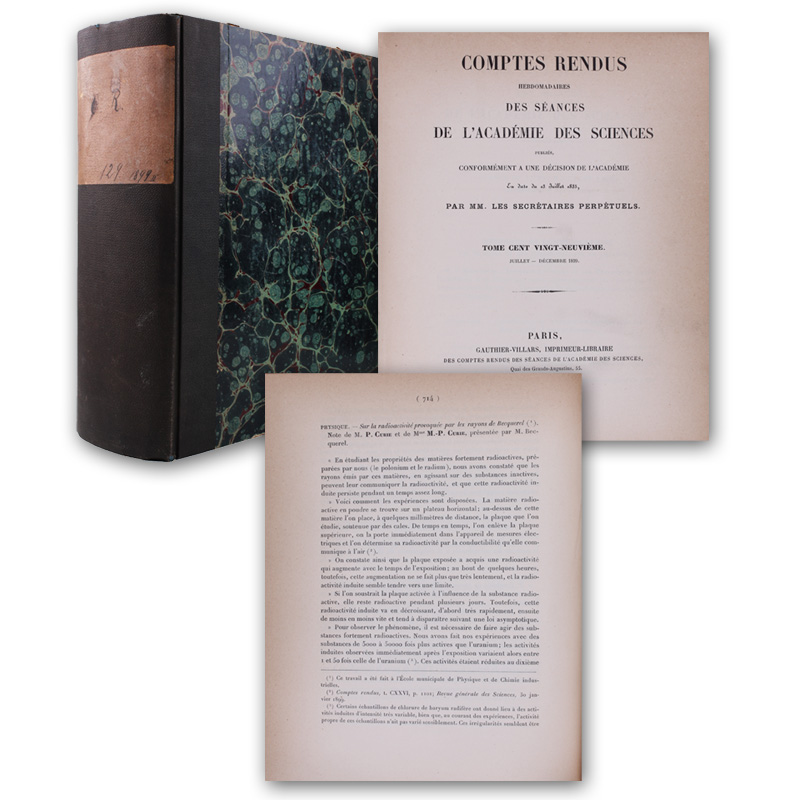 Sur la radioactivité provoquée par les rayons de Becquerel. SS. 714-716. - Und: Dieselben. Effets chimiques produits par les rayons de Becquerel. SS. 823-825. - Und: M. S. Curie. Sur le poids atomique du métal dans le chlorure de baryum radifčre. SS. 760-762. - Und: Henri Becquerel. Observations ŕ propos d'une communication de M. et Mme Curie. S. 716. In: Comptes Rendus... de l'Académie de Sciences. Tome 129.