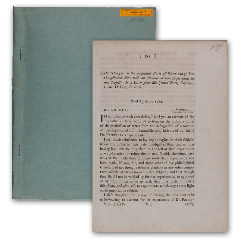 Thoughts on the constituent Parts of Water and of Dephlogisticated Air; with an Account of some Experiments on that subject. SS. 329-353. - Und: Derselbe. Sequel to the Thoughts on the constituent Parts of Water and of Dephlogisticated Air. In a subsequent Letter... to Mr. De Luc. SS. 354-357. Aus: Philosophical Transactions of the Royal Society of London. Vol. 74.