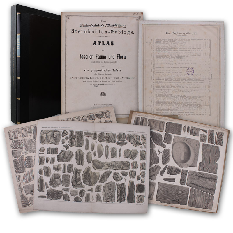 Das Niederrheinisch-Westfälische Steinkohlen-Gebirge. Atlas der fossilen Fauna und Flora in 40 Blättern, nach Originalen photographirt. Nebst 4 geognostischen Tafeln, alle Flötze der Horizonte Oberhausen, Essen, Bochum und Dortmund nach mittleren Abständen, im Maßstabe von 1: 2000 darstellend. 2 Bände.
