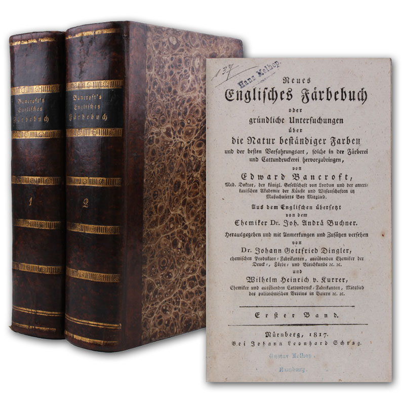 Neues Englisches Färbebuch oder gründliche Untersuchungen über die Natur beständiger Farben und der besten Verfahrungsart, solche in der Färberei und Cattundruckerei hervorzubringen. Aus dem Englischen übersetzt von J. A. Buchner. Herausgegeben und mit Anmerkungen und Zusätzen versehen von J. G. Dingler und W. H. von Kurrer. 2 Bände.