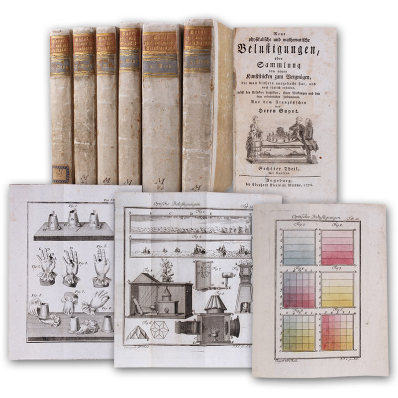 Neue physikalische und mathematische Belustigungen, oder Sammlung von neuen Kunststücken zum Vergnügen, mit dem Magnete, mit den Zahlen, aus der Optik sowohl, als aus der Chymie, nebst den Ursachen derselben, ihren Wirkungen und den dazu erforderlichen Instrumenten. 7 Teile in 6 Bänden.