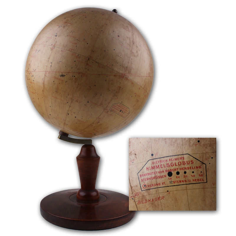 Himmelsglobus. Pappmaché-Kugel mit 12 gedruckten Papiersegmenten bezogen, die Sterne in Schwarz, die deutsche Beschriftung in Rot, die Isophoten der Milchstraße nach Graff und Houzeau, mit Angabe der Sterngrößen in fünf Stufen.