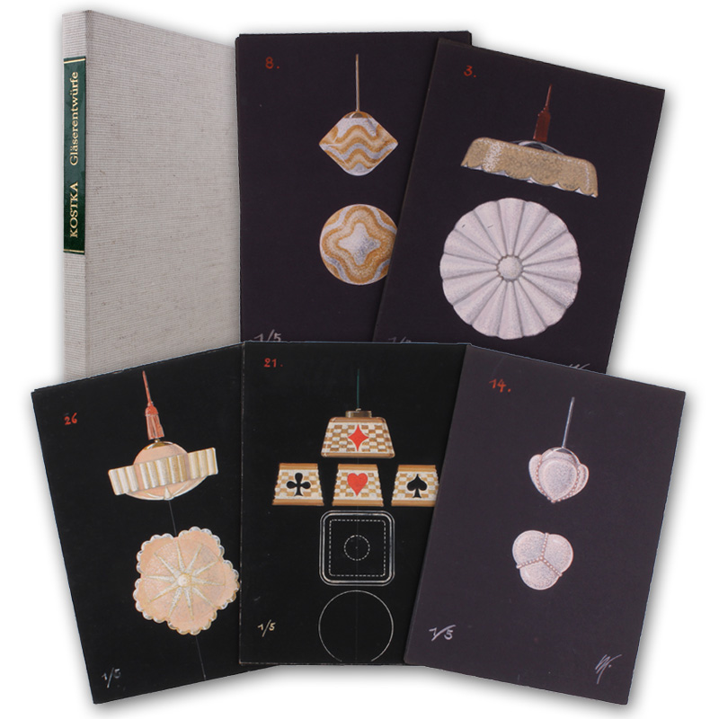 (Ca. 1925-28). (21 x 15 cm). 24 Blätter. Mit 28 nummerierten Entwurfs- oder Musterzeichnungen für gläserne Lampen im [...]
