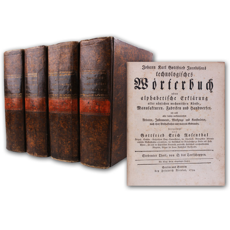 Technologisches Wörterbuch oder alphabetische Erklärung aller nützlichen mechanischen Künste Manufakturen Fabriken und Handwerker, wie auch aller dabey vorkommenden Arbeiten Instrumente Werkzeuge und Kunstwörter nach ihrer Beschaffenheit und wahrem Gebrauche herausgegeben von Otto Ludwig Hartwig. - Und: Gottfried Erich Rosenthal (Hrsg.) Litteratur der Technologie... 9 Teile in 4 Bänden.