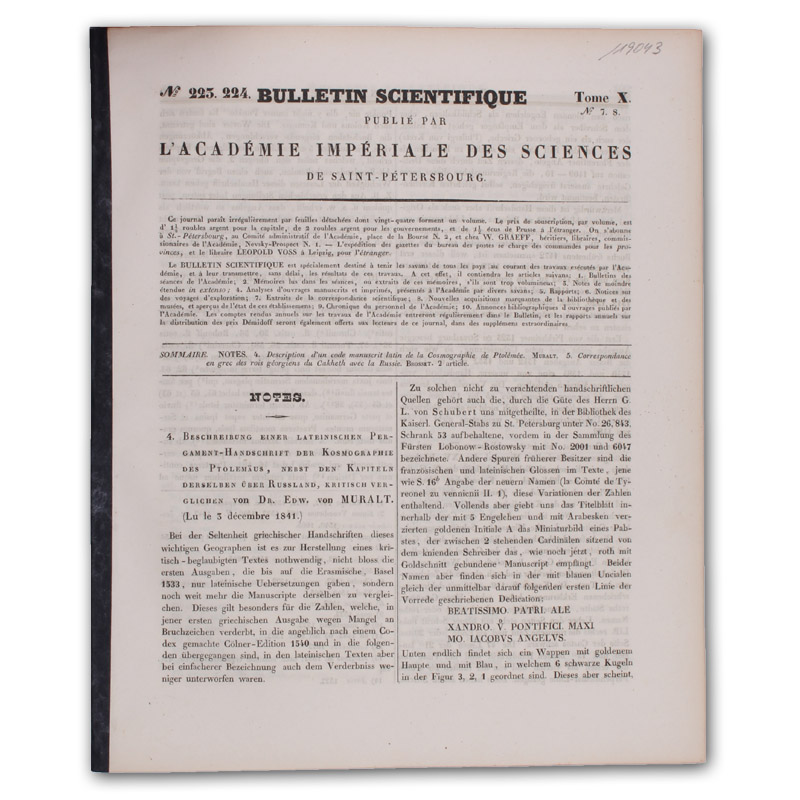 Beschreibung einer lateinischen Pergament-Handschrift der Kosmographie des Ptolemäus, nebst den Kapiteln derselben über Russland, kritisch verglichen. Sp. (97)-128. In: Bulletin de l'Acade´mie impe´riale des sciences de St.-Pe´tersbourg. Tome 10, No.7-8.