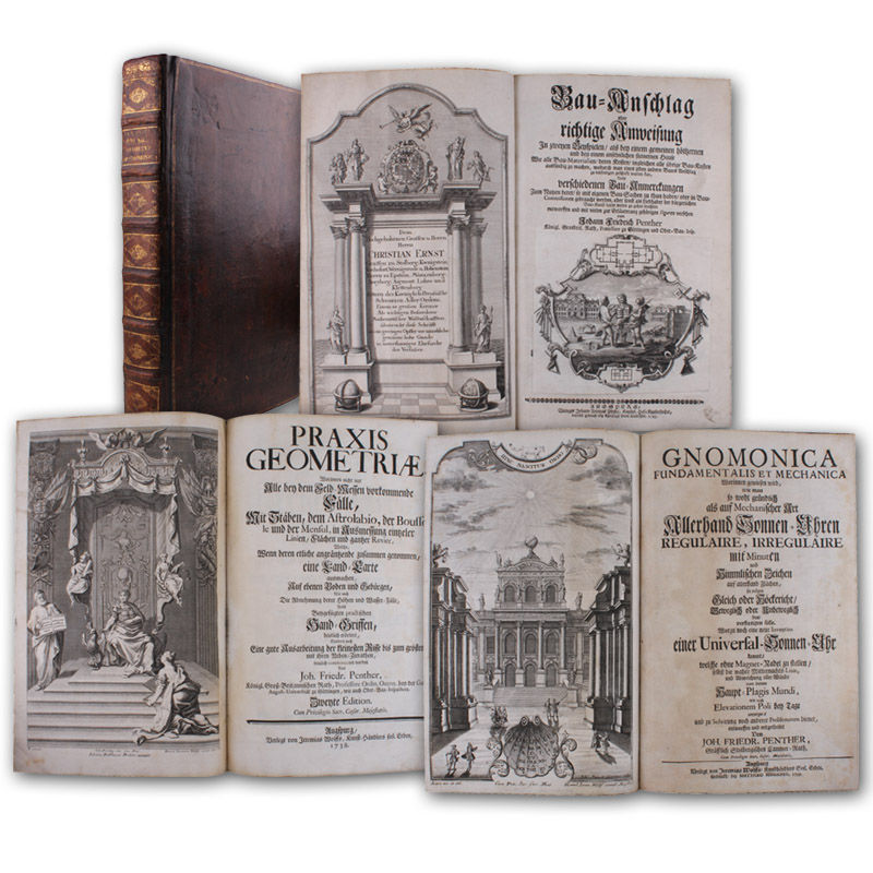 Bau-Anschlag oder richtige Anweisung... wie alle Bau-Materialien, deren Kosten, ingleichen alle übrigen Bau-Kosten ausfündig zu machen, wodurch man eines jeden andern Baues Anschlag zu verfertigen geschickt werden kan. Augsburg. Pfeffel. 1743. (33 x 21,5 cm). (8) 204 S. Mit gestochenem Titel, zwei gestochenen Titelvignetten und 17 gefalteten Kupfertafeln. - Und: Derselbe. Praxis geometriae, worinnen nicht nur alle bey dem Feld-Messen vorkommende Fälle mit Stäben, dem Astrolabio, der Boussole und der Mensul in Ausmessung eintzeler (!) Linien, Flächen und gantzer Revier... deutlich erörtert... werden. 2. Edition. Augsburg. Wolff. 1738. (10) 97 (5) S. Mit gestochenem Frontispiz, 3 (1 gestochenen) Textvignetten und 25 gefalteten Kupfertafeln. - Und: Derselbe. Gnomonica fundamentalis et mechanica. Worinnen gewiesen wird, wie man so wohl gründlich als auf mechanischer Art allerhand Sonnen-Uhren, Regulaire, Irregulaire mit Minuten und himmlischen Zeichen auf allerhand Flächen... verfertigen solle. Wozu noch eine neue Invention einer Universal-Sonnen-Uhr kommt...